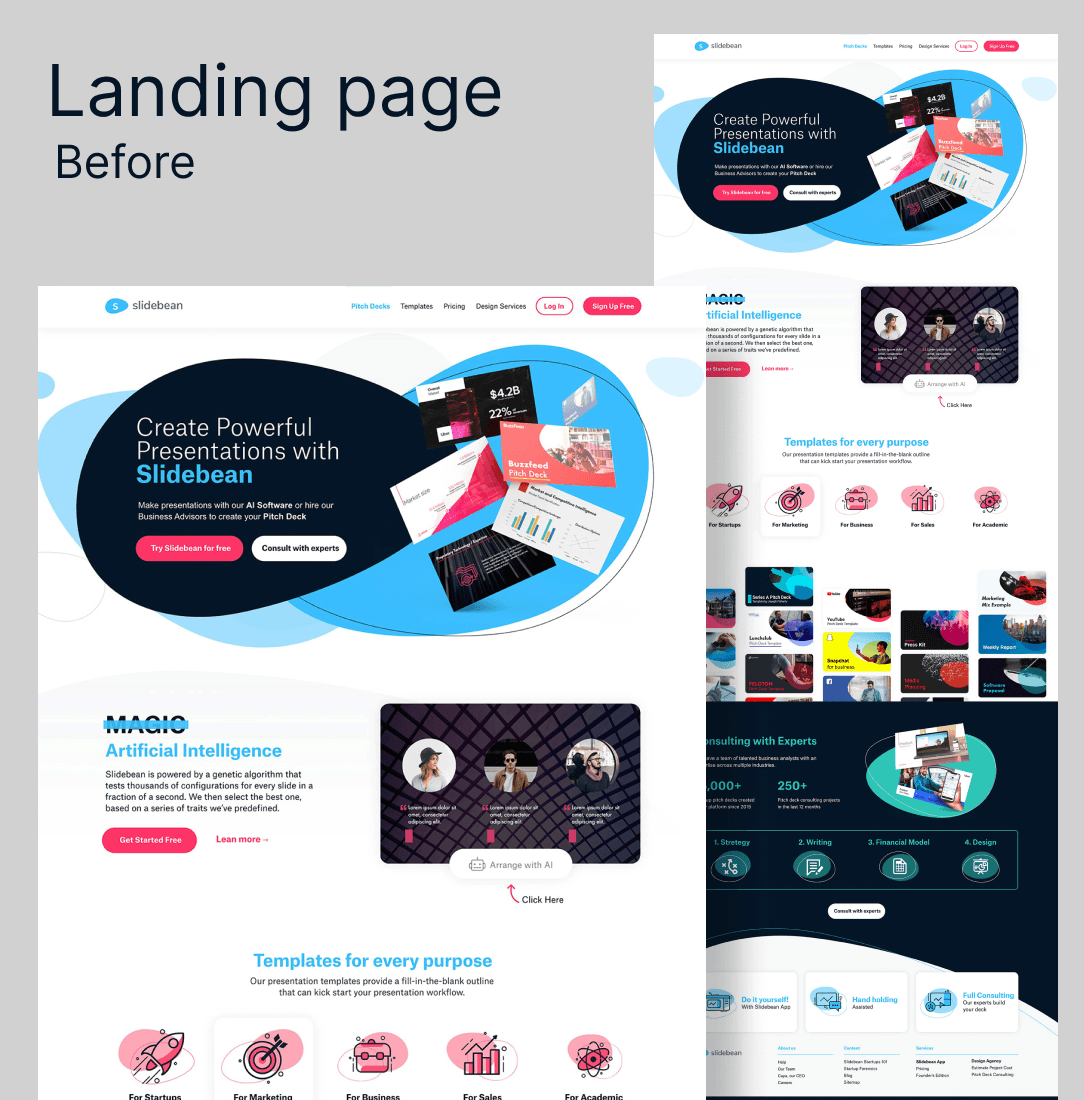 As a Visual Designer at Slidebean, I had the opportunity to redesign the web app and the marketing website. I played a key role in enhancing the visual aesthetics and user experience of both platforms, creating a cohesive and modern design that aligned with the company's brand identity.